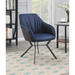 Las vibraciones retro y los materiales combinados realzan el aspecto de esta silla de comedor contemporánea. Un asiento tapizado cuenta con elegantes apoyabrazos inclinados y un interior de cuero sintético azul, envuelto con un respaldo de tela de cuero sintético marrón acolchado con rombos para crear un contraste sutil. Los detalles de ribetes y la espalda holgada crean un toque atemporal pero cómodo e informal. Esta silla de comedor también descansa sobre una base de metal con un acabado bronce que ofrece una apariencia elegante y con estilo. Las piernas delgadas y angulosas se ensanchan dramáticamente hacia afuera, ofreciendo un estilo retro.
