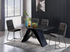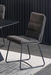 - Mesa con tapa de piedra sinterizada y sillas tapizadas en tela marrón con base de metal oscuro.