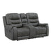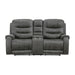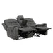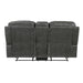 Es un loveseat para 2 personas tapizado en microfibra color gris oscuro.
